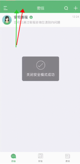 安全是密信系列产品的核心价值之一,在密信独有的安全模式下进行的所有聊天信息、传送的文件等都是经过端到端加密的,用户可以通过设置安全口令来控制安全模式的开启和关闭,确保聊天信息不外泄。下面来介绍如何使用安全模式: