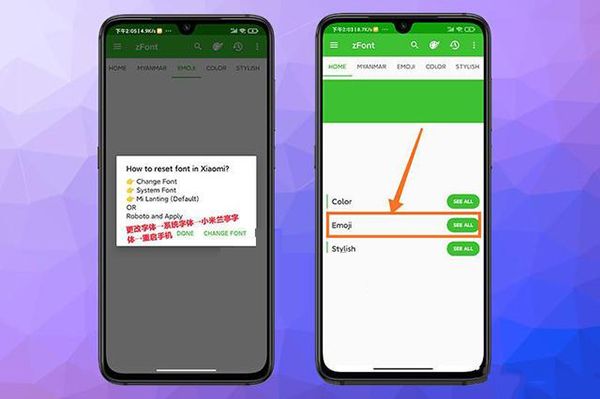 4、重启后重新打开zfont,点击Home页面 ,选择emoji,再点击See All(看全部),按照这个流程操作之后,zfont的emoji表情包就已经可以正常使用啦。