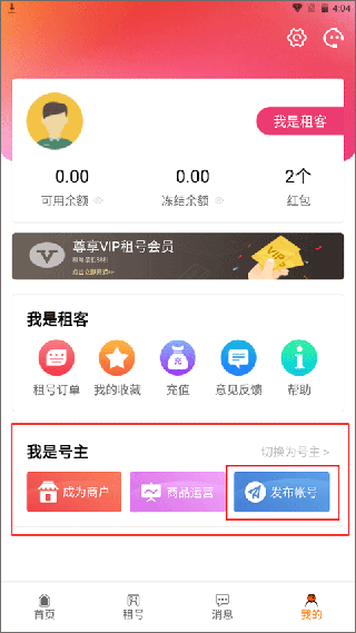 1、首选进入优号租app最新版首页切换到【我的】功能模块界面,这里包含租客和号主两种身份,如果想要发布游戏账号信息,点击右边的“发布账号”按钮。