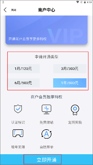 (2)你选择你申请开通的类型,了解商户会员独享的特权,然后点击立即开通。
