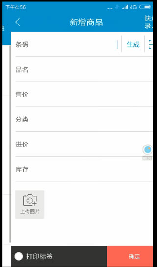 或者点击生成,自动生成条码。然后输入对应的售价,进货价等信息,并且可以选择上传商品图片。商品资料创建完后,就可以进行收银。