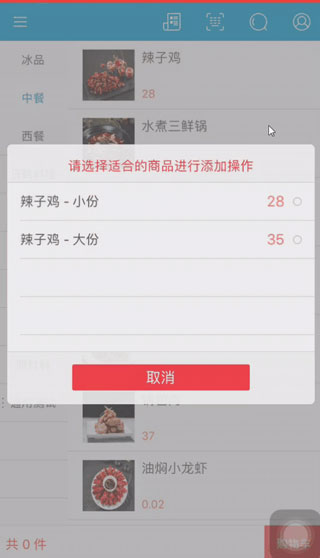 选择需要的菜品下单,若是会员来消费,则选择右上角人形图标,进入会员搜索界面,输入会员信息查找选中即可。