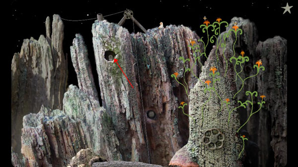 3、点击右边的绳子,点击像信箱一样的机关上面的红色按钮,把小人吊上来。