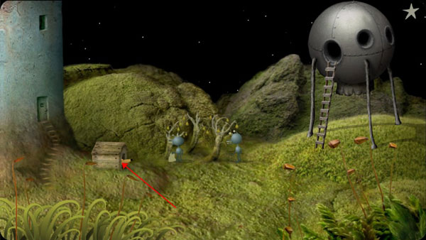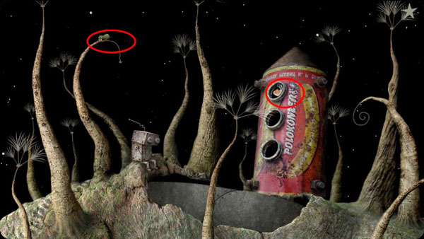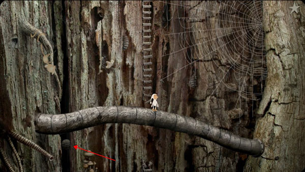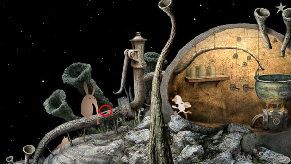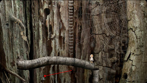 2、点击飞船里的主角,主角出来后被树枝卡主,然后再点击左边树枝上的虫子到主角被卡主的树枝上去放下主角,点击左下角的路去往下一个画面
