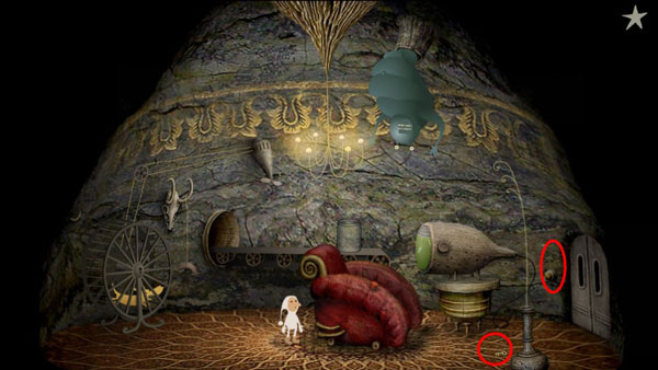 17、当主角被抓住后,将狗笼前方的重物挂到狗笼后面的骨头装饰上,趁老板帽子被卷起来的时候按一下沙发右边的按钮,主角被放下来后马上点一下沙发,然后主角走到沙发后方捡起钥匙打开狗笼,按下右边电梯的按钮,第一章就结束了