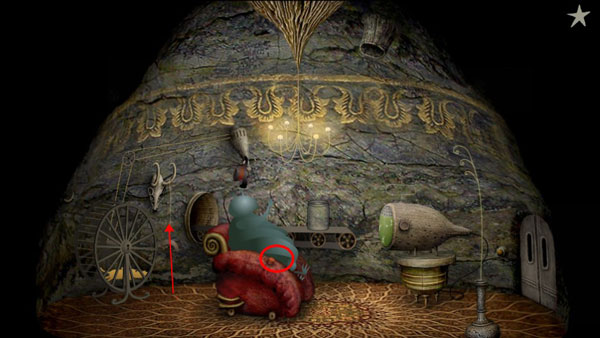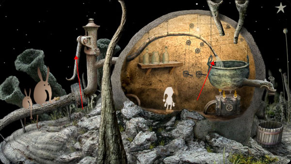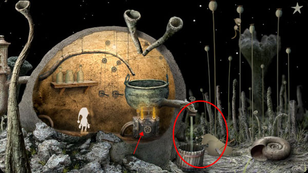 7、开启炉子下方的火炉,点击水龙头,蜗牛会跑过来喝水,等蜗牛昏睡后捡起地上的铁锤,回到上一画面后点击一下机器人去往下一关