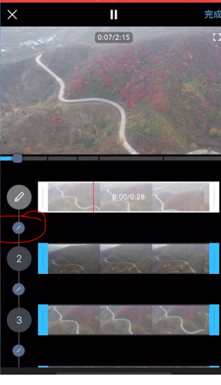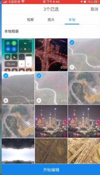 在手机上选择需要编辑的几段航拍素材,然后点开始编辑进入视频编辑界面
