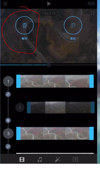 在一段素材上长按可以删除该段素材,也可以移动素材的位置。每段素材左右两端往中间拖动,可以剪掉两边多余的部分,只使用中间部分。