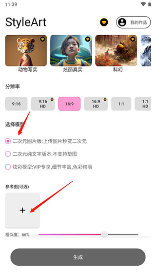 1、如果想要上传照片到StyleArt软件中,在选择模型时应当选择二次元图片版,然后点击参考图;