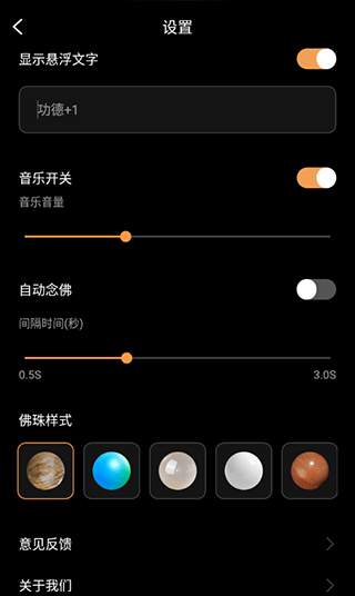 2、点击齿轮标志进入设置界面,可以自定义悬浮文字,调整音量开关,开启自动念佛功能,以及选择电子佛珠皮肤