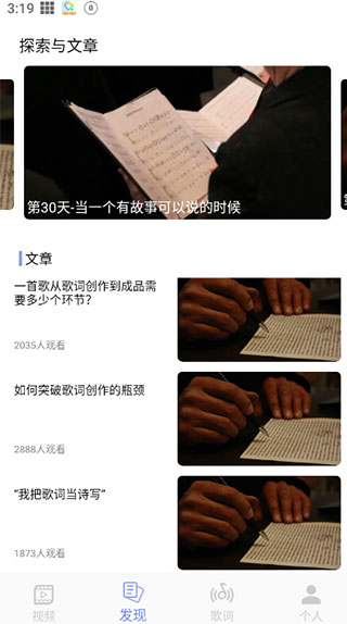 2、在发现当中有很多大佬分享的作曲经验,帮助你写出动人的歌曲歌词。