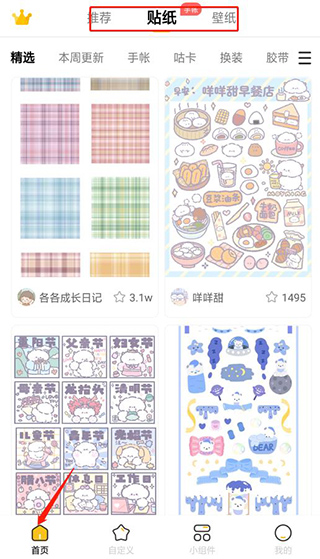 1、下载安装超萌鸭app,进入首页大家可以看到推荐、贴纸、壁纸等功能,要做手账的朋友可以使用这里的贴纸;