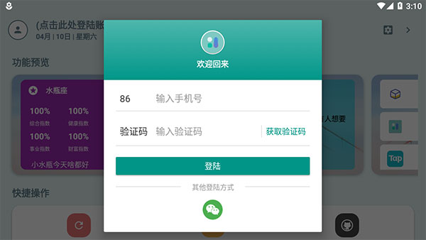 2、在首页中你可以看到各种各样的功能模块,而点击首页左上方的头像标志,输入手机号码和验证码,或者点击微信即可一键登录。