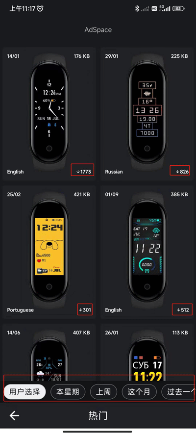 进入后可查看每一个表盘的下载量,还可以根据统计周期进行筛选