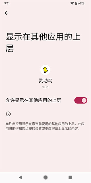 1、下载并打开灵动鸟,来到下方界面,按照界面提示,授予灵动鸟悬浮窗口/显示在应用上层权限;