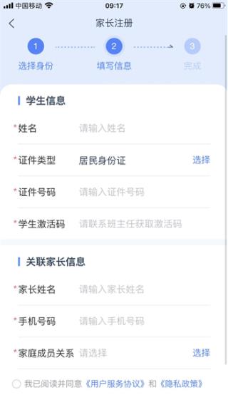 在家长注册界面需填写学生信息、学生激活码,家长信息,勾选服务协议,点击【下一步】,学生信息校验通过后,家长设置自己的登录用户名/密码,点击【下一步】进入首页。