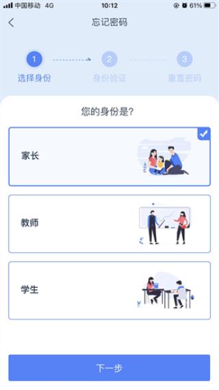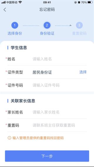 家长忘记登录密码,点击APP的“忘记密码”,选择家长身份,输入学生信息、家长姓名和重置码信息来进行密码重置。