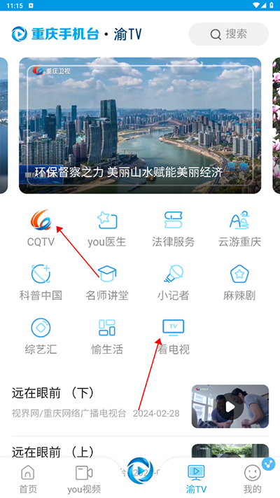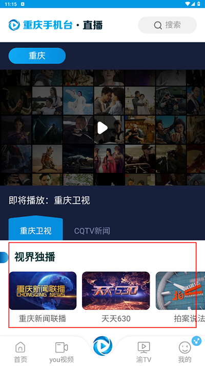 1、打开重庆手机台客户端,进入"渝tv"页面点击“看电视”或者点击“CQTV”;