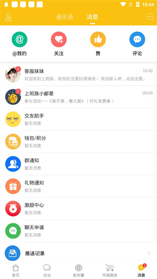 界面设计简洁明了,首页涵盖了城市信息、相亲交友、美食等内容,论坛里大家还可以讨论热点话题、分享消费经验。族友圈更是热闹非凡,用户可以发布自己的生活动态,认识更多本地网友。消息功能则方便用户查看好友互动和最新资讯。