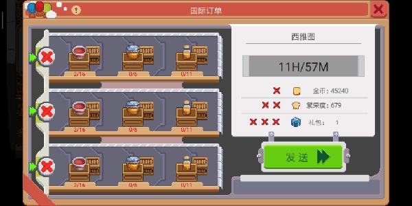 普通订单的货物是固定的,收集齐物品发送订单后,就完成订单获得固定的金币和繁荣度。