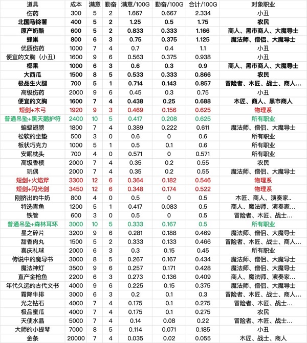 综合一下上面的数据,常见物品赠送得到的最高满意/勤奋按性价比排序如下。