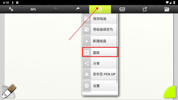 1、打开主菜单,点击菜单栏上的Artrage标志,然后点击菜单中的"图库"。
