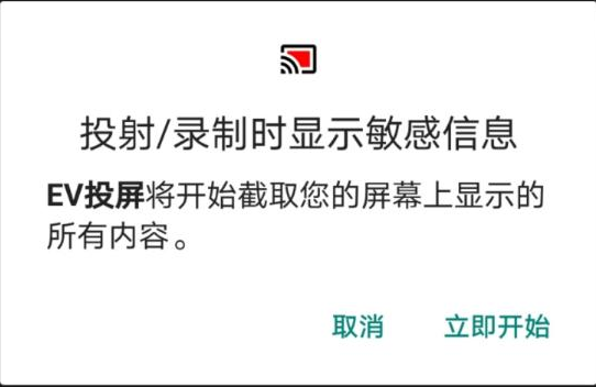 选择并点击要连接的设备,系统提示“投射/录制时显示敏感信息”“EV投屏将开始截取您的屏幕上显示的所有内容”。