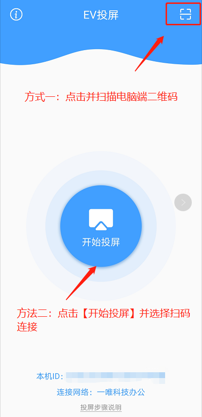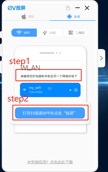 3、电脑和手机同时打开EV投屏,两个设备需要处于同一个WiFi环境下。