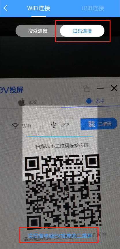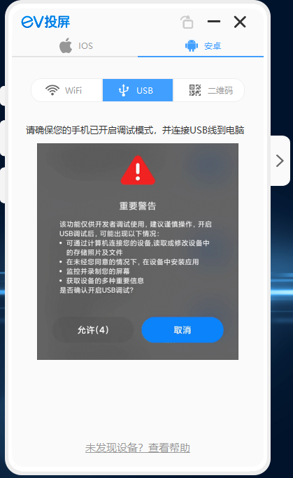 安卓系统有WiFi连接、USB和二维码三种连接方式。