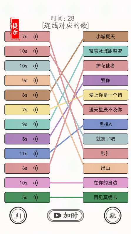 这个游戏的玩法就是先听左边的音乐,然后找到对应的歌名,连接起来,全部连对就可以进入下一下关。
