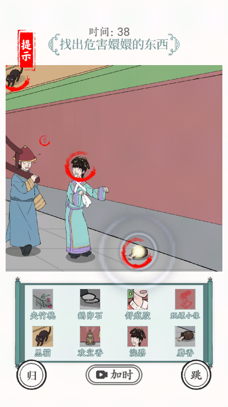 玩家需要找出危害嬛嬛的八个东西,然后直接点击图上的危险元素,如果找对了,游戏就会给这个物品划上圈,并且出现在下方那一栏。