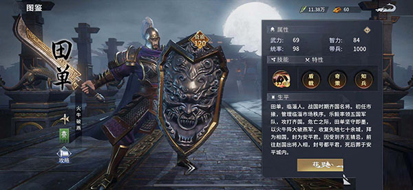 2、田单,橙色级别武将,武力69,统率98,智力84,带兵1000,技能是增加自身伤害力,特性能力是防御性质。