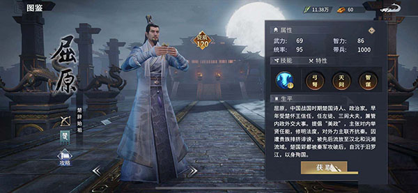 5、屈原,橙色级别武将,武力69,统率95,智力86,带兵1000,技能可以让敌方缴械8秒,特性远程弓箭手。