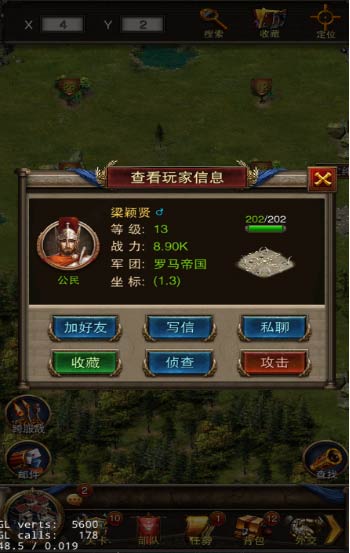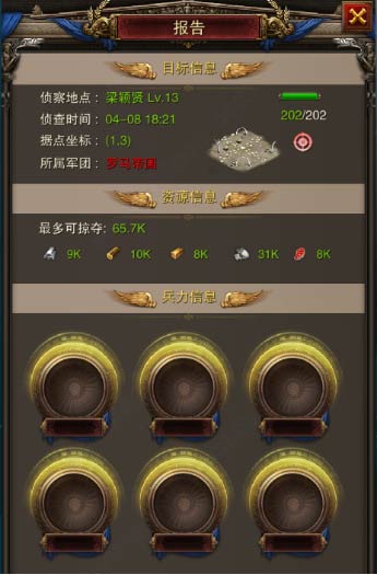 2、攻击前最好先对该玩家城市进行侦查,查看可掠夺的资源总数和玩家的防守阵型。以便针对性配置阵型,并衡量投入产出比。
