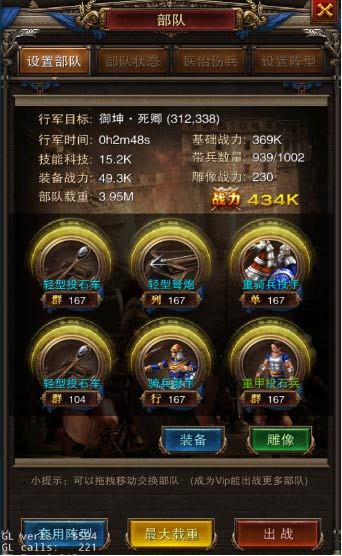 3、点击【攻击】,会进入战斗部署界面,可以将空闲的士兵拖到编队中,并配置装备和雕像资源。也可以通过【最大战力】和【最大载重快速】编队,部队的载重能力越强,可掠夺的最大资源越大,掠夺资源的速度也会越快。