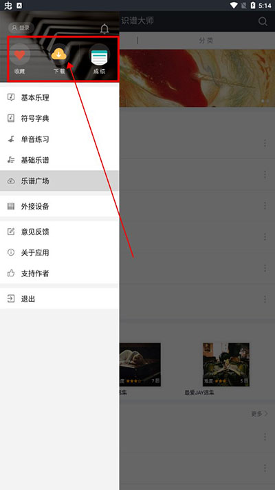 9、在左侧的工具栏还能够快速查看自己收藏和下载的乐谱,还能够查看自己的练习成绩;
