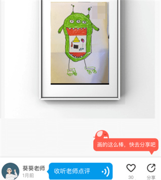 由于是录播课,互动性较差,学龄前儿童还是没有良好的自制力的,课堂中讲解的知识点,不能确保孩子是否掌握,因此家⻓需要陪同上课,并适当帮忙传达老师的意思。还有就是当孩子画完之后传到小程序,老师会给你点评,点评从绘画思路、技巧和创作能力等方面来讲,而且会分析小朋友的绘画特点,不足之处,点评也还是比较专业的。