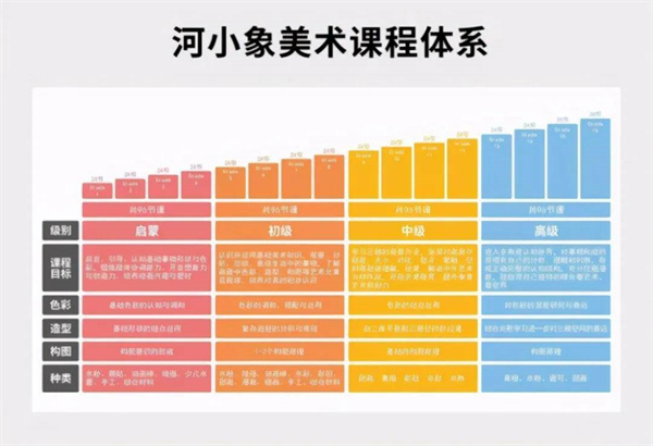 1、课程体系河小象从课程体系上看,针对3-12岁孩子,课时比较多,主要分四个不同阶段,学龄前在启蒙。难度上升都是比较平缓的,一开始教简单的线条、色彩,以认识、了解为主,主打孩子无意识的画,到后几个阶段开始教孩子“创造”,真正学画画。