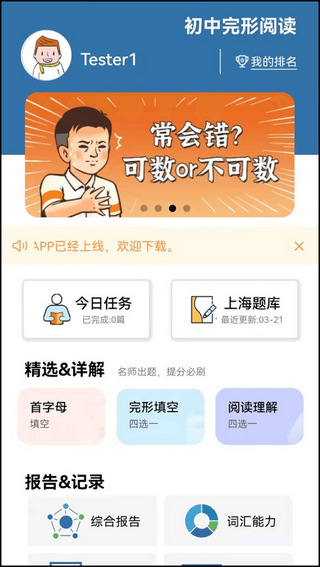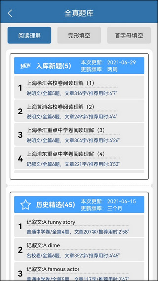 1、海量阅读完形题库三种题型:阅读理解、完形填空、首字母填空。题目内容精致,涉及领域全面,知识点清晰。300+篇精选文章,题库持续更新增加