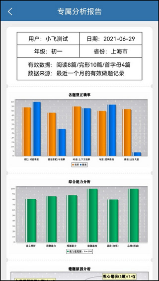 对VIP用户,每周生成专属的深度成绩报告。从词汇,做题速度,理解能力等多角度分析和总结。传统纸质做题练习,无法做到