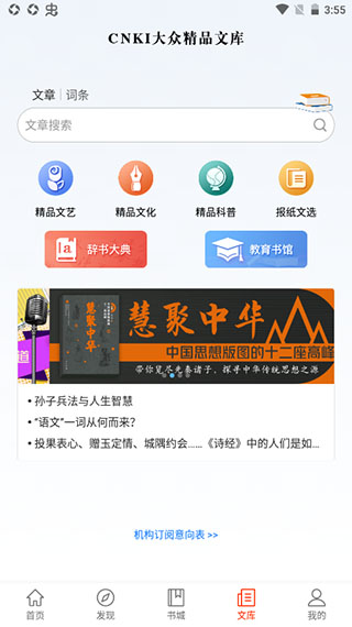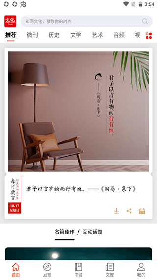 1、打开知网文化app,进入软件首页,用户可看软件推荐文章
