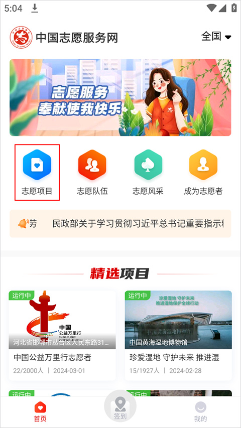在【首页】中点击【志愿项目】板块,通过筛选条件找到适合自己的志愿活动;进入心仪项目的详情页面后,点击【立即报名】,选择相应岗位并完成报名。需要注意的是,平台只显示对外招募的项目,部分活动可能设有条件限制,需符合条件才能成功参与。
