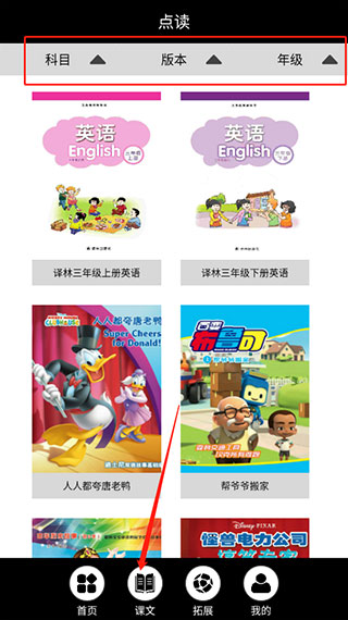 3、点击课文,可以选择科目版本年级等..