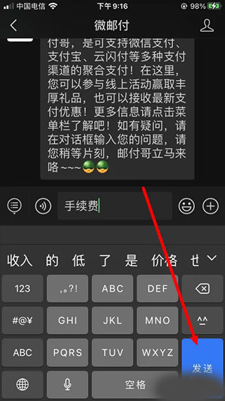 首先在微信里打开【微邮付】公众号,点击【图标】。