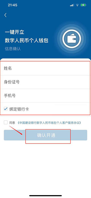 4、在这里确认姓名、身份证号、手机号及绑定的银行卡号无误后勾选下方同意服务协议,最后点击下方确认开通即可。