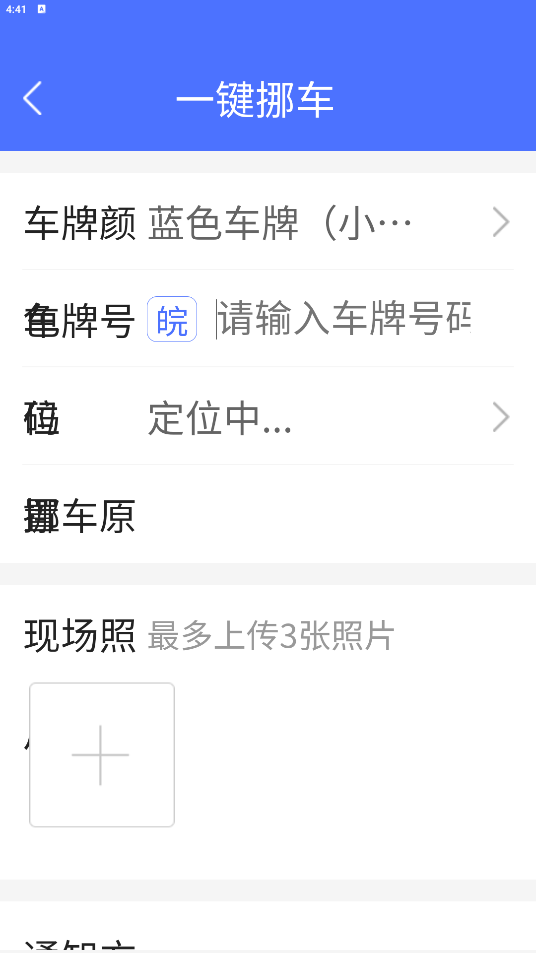 2、输入车牌号和挪车原因和现场照片,点击发起挪车。