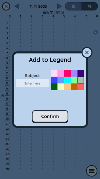 9、周视图中的另一个编辑功能是能够为跟踪器添加时间。当您忘记使用游戏中的定时器时,这是很有帮助的。点击上面的"大加"符号来增加当天的时间。你需要在军事时间里增加时间。选择颜色。您可以通过点击图例中列出的颜色并编辑它来链接主题到颜色。