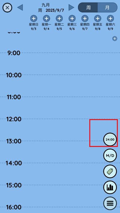 10、屏幕右下角的下拉菜单下的其他按钮是"24:00"按钮,你可以点击这个按钮在军事时间和"12:00"之间切换,即在跟踪器的周视图中的垂直时间轴上,时间为上午12:00。另一个按钮是"M/D",如果你在你的国家适用的话,你可以用它来按月或日的顺序。