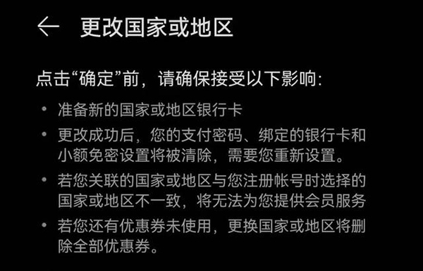 2、进入“国家/地区”选项,会提示注意事项,然后将国家设置为“英国”(其他欧洲国家都可以)。