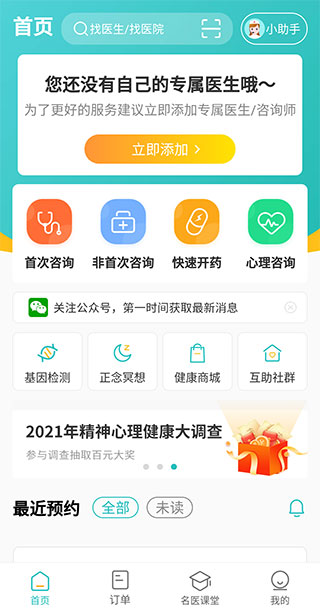 1、首先我们在本站下载安装并打开这款软件,完成注册登录的操作后会来到首页,这里为我们展示的是心理咨询和快速开药服务,点击下方的基因检测、正念冥想、健康商城和互助社群按钮也会跳转至相应的小程序中完成进一步操作,下方也有显示最近预约的提醒;